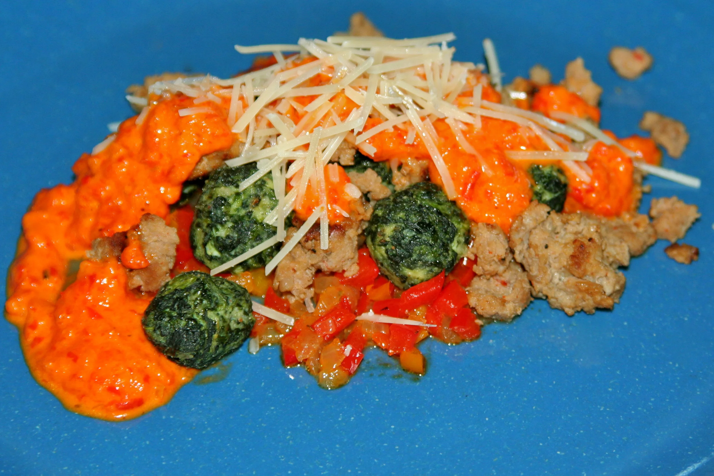 Spinach "Gnocchi" with Turkey Italian Sausage and Red Pepper Sauce